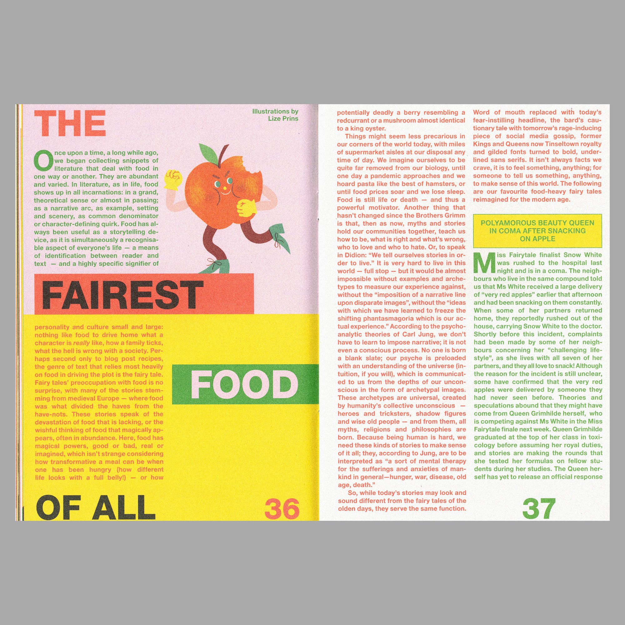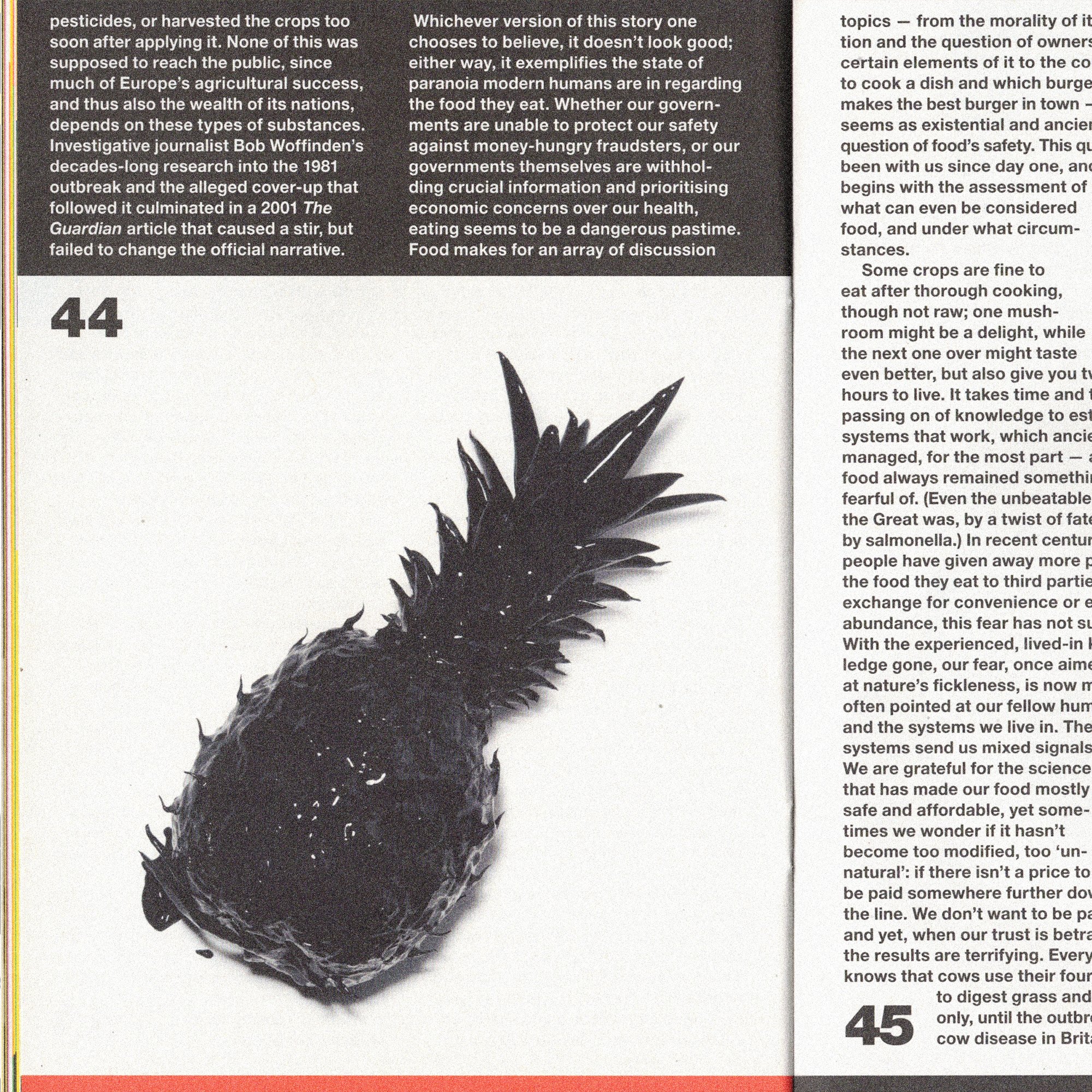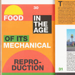 CON TEXTOS SOBRE LA CULTURA DEL CHEF, LA DIPLOMACIA GASTRONÓMICA, LA PARANOIA EN TORNO A LA SEGURIDAD ALIMENTARIA, LOS MICROONDAS, LAS LEYENDAS URBANAS DE INTERNET Y LOS “CRÍMENES ALIMENTARIOS”, EL DISEÑO GRÁFICO DE LA REVISTA SE INSPIRA EN LOS PERIÓDICOS SENSACIONALISTAS, EN SINTONÍA CON EL TONO ESCANDALOSO Y PROVOCADOR DE ESTE FASCÍCULO.