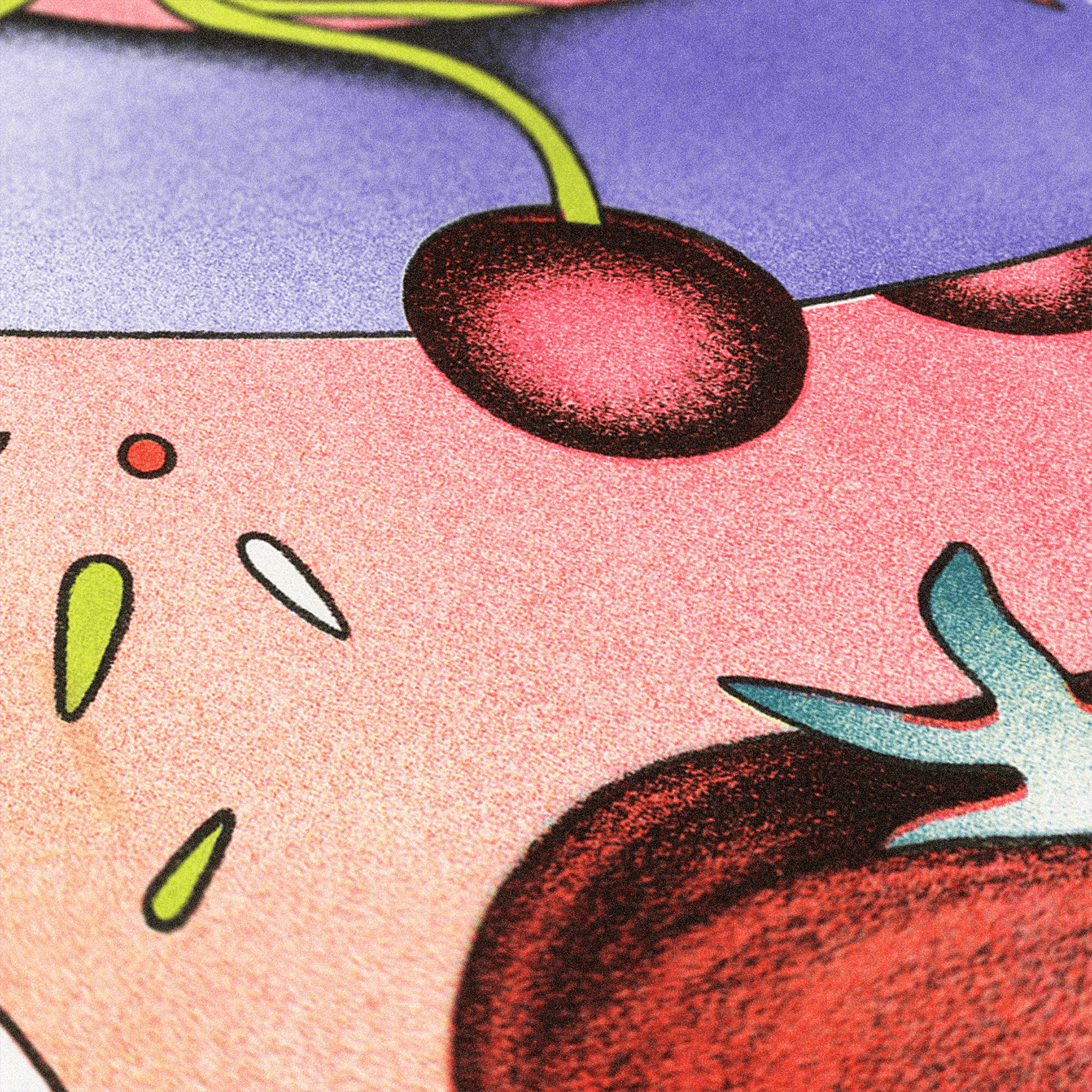ILUSTRACIÓN IMPRESA EN RISOGRAFÍA POR LINDA MERAD™. UN CALENDARIO DE FRUTAS DE TEMPORADA IMPRESO EN FORMATO A2.